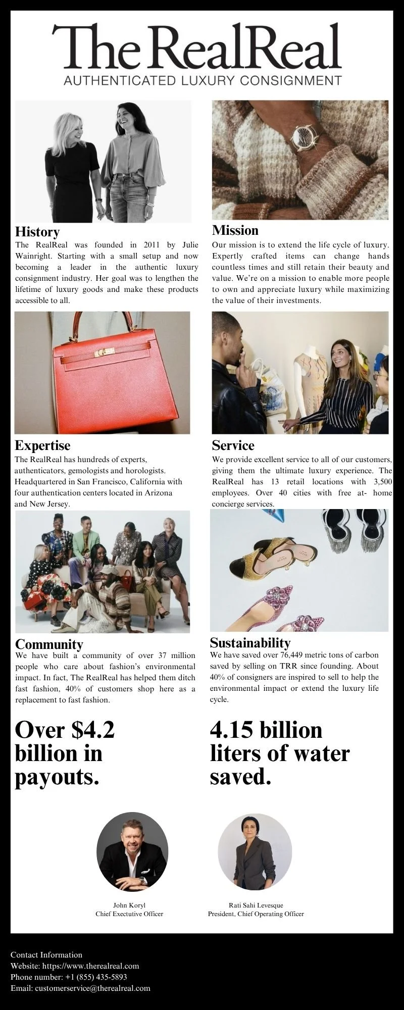 This fact sheet showcases The RealReal’s history, mission, and sustainability achievements through clear visuals and key brand data.